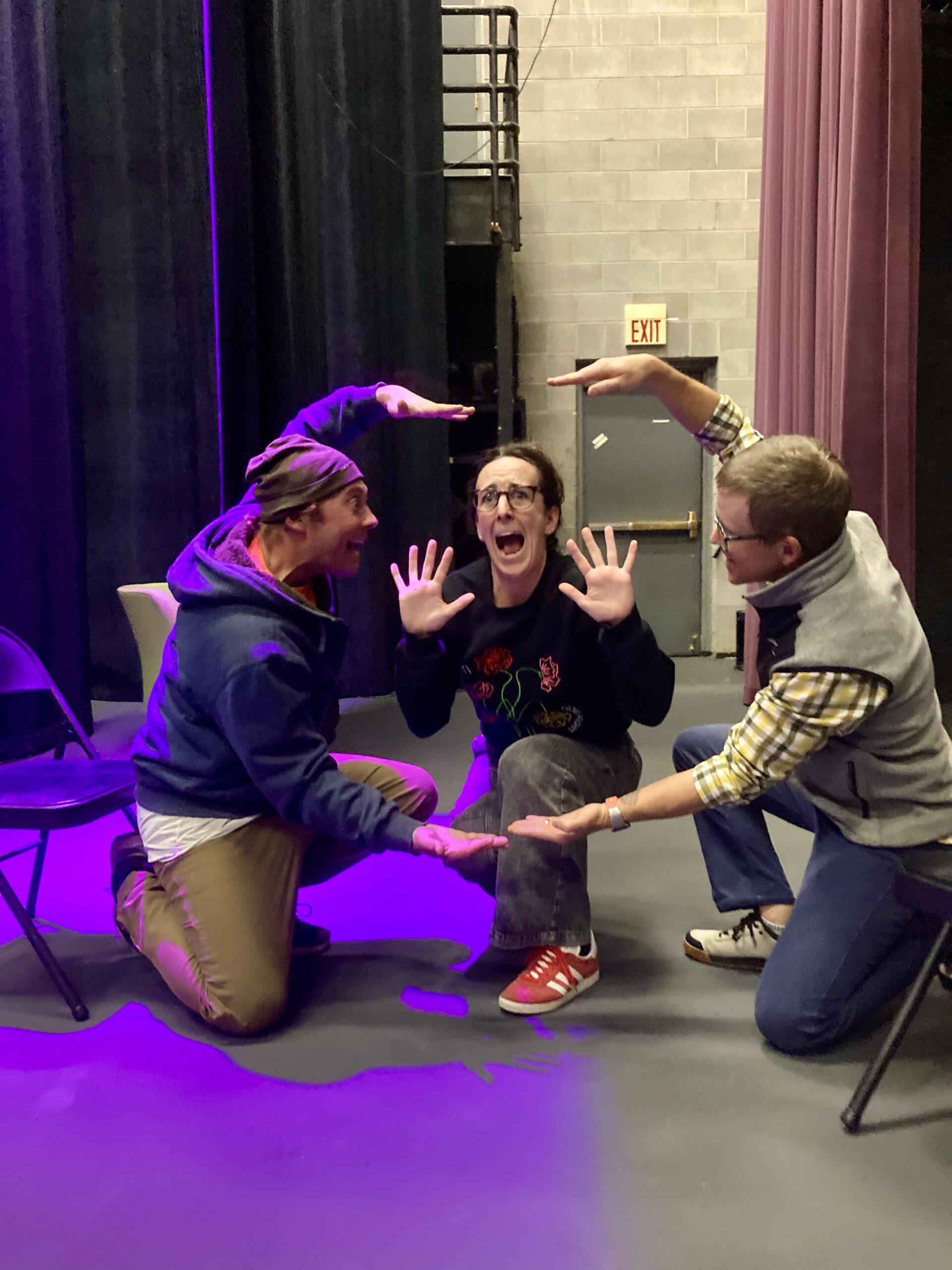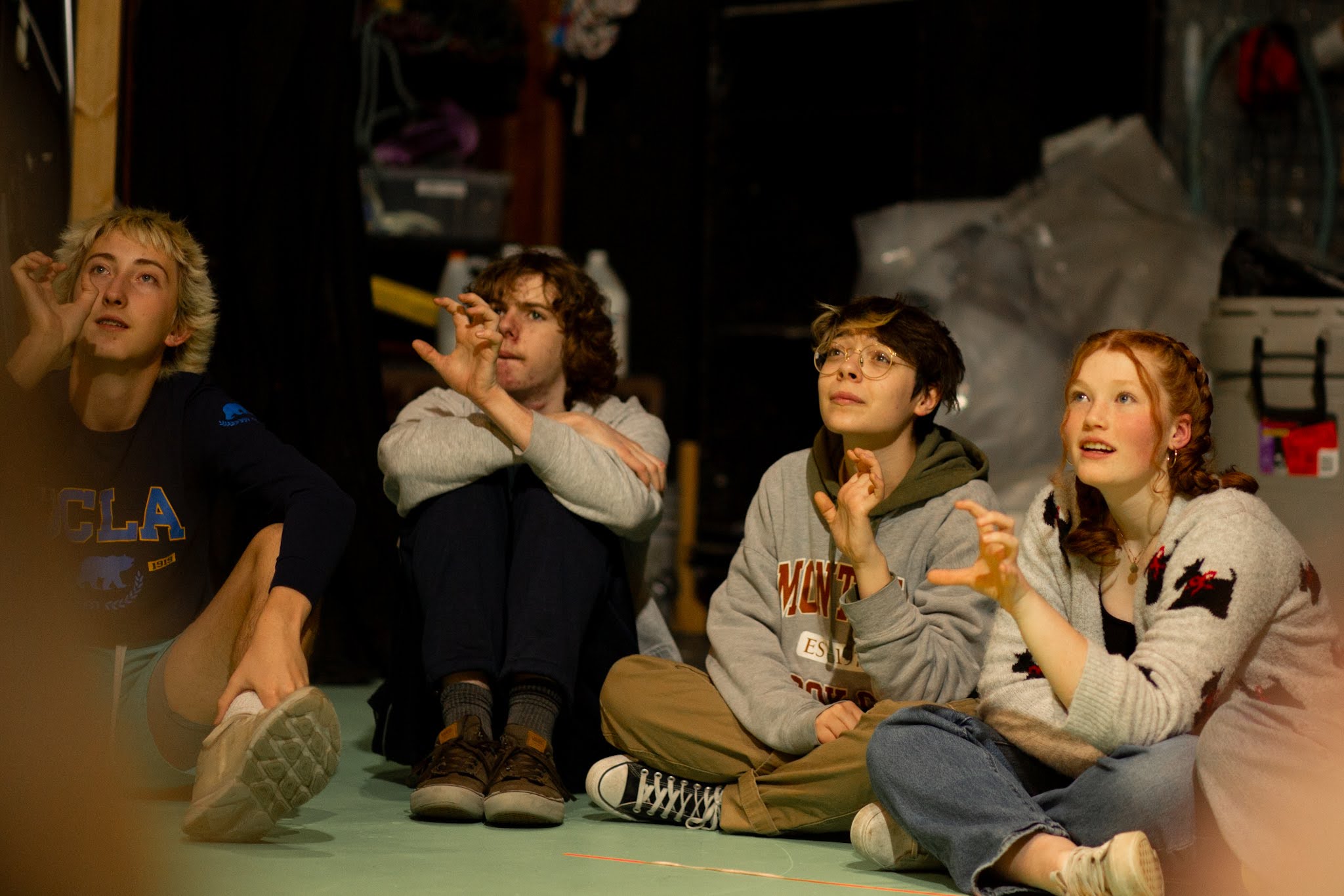 Students’ favorite exercise was called “The Dot” in which they learned how to create the illusion of a dot in space and react energetically to it – “with 20,000 volts of energy,” directed Bill – to show its size, weight, and movement. Bill explained, “You’re seeing and responding with such intensity that you’re making the audience see what you see.” The illusion was simple but powerful – imaginary dots pulled students around on stage as they practiced trusting their bodies’ innate knowledge while honing their ability to focus.